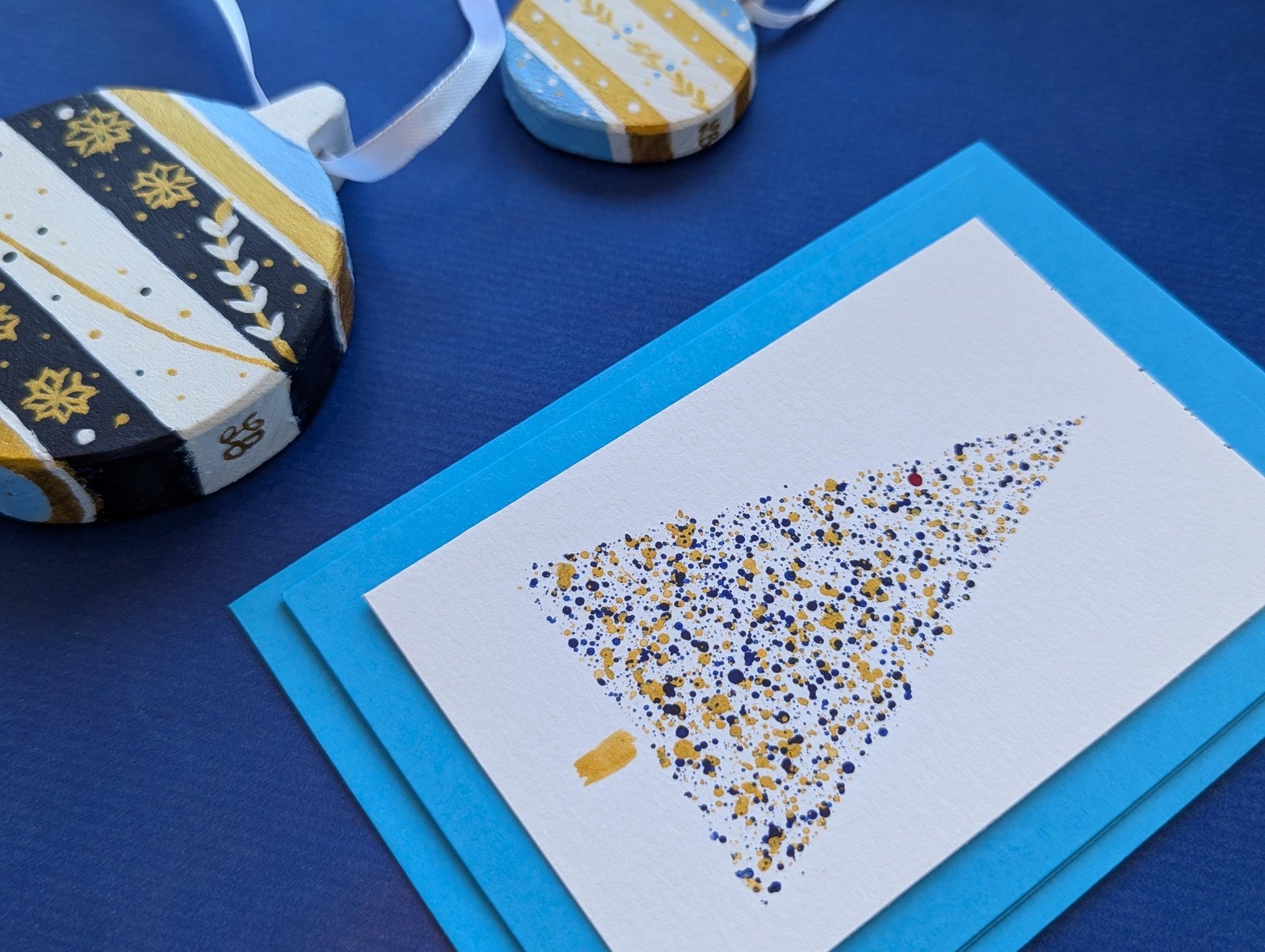 Hand-Painted Blue Wood Christmas Ornaments & Card Set: Boho Holiday Decor