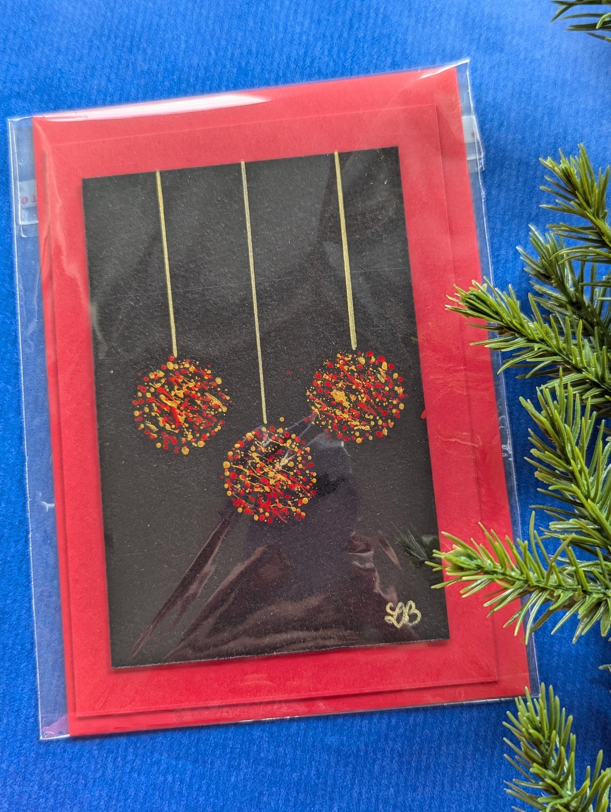 Send some holiday cheer with these handmade Christmas Card! The cards features a simple, stylish Christmas baubles design and Christmas tree on a black paper with splashes of gold and red, gold and white or red, gold and green. Perfect for anyone who loves a modern, minimalist look with a touch of sparkle.
