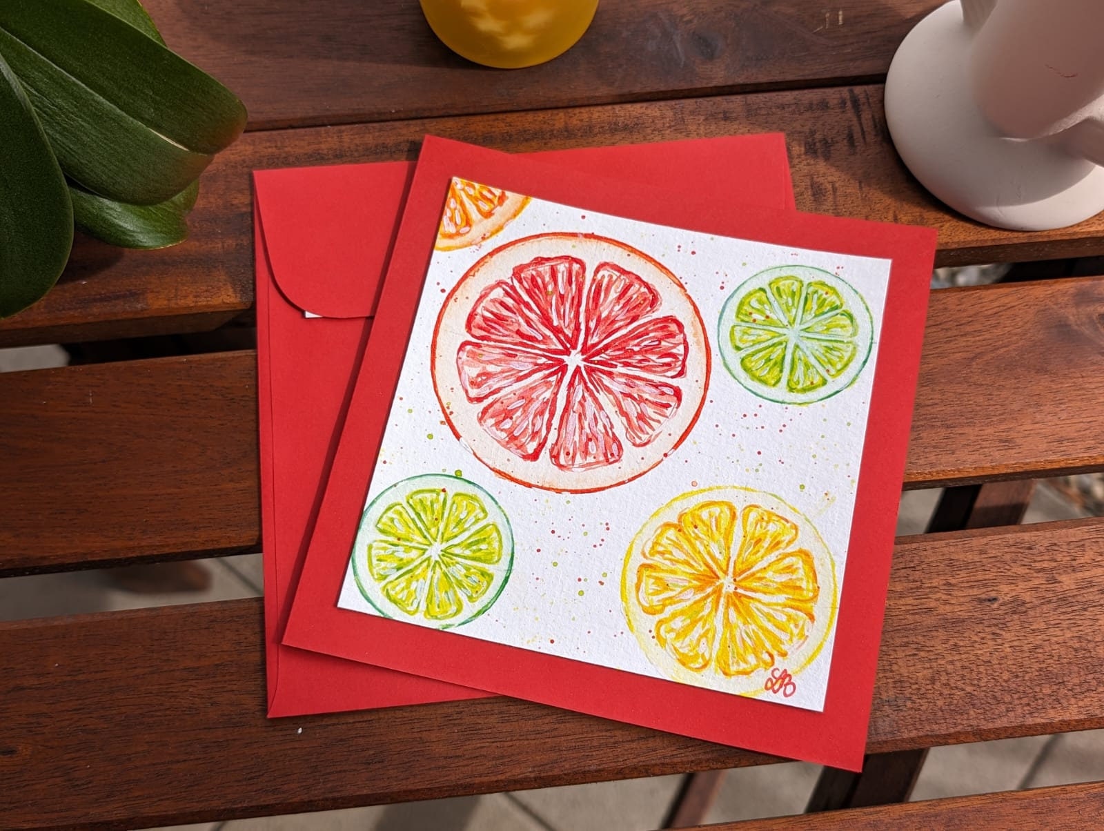 Brighten someone's day with this hand-painted greeting card featuring colorful citrus slices! With oranges, lemons, and limes in a fun and vibrant design, this card is perfect for any occasion—birthdays, thank-yous, or just because.