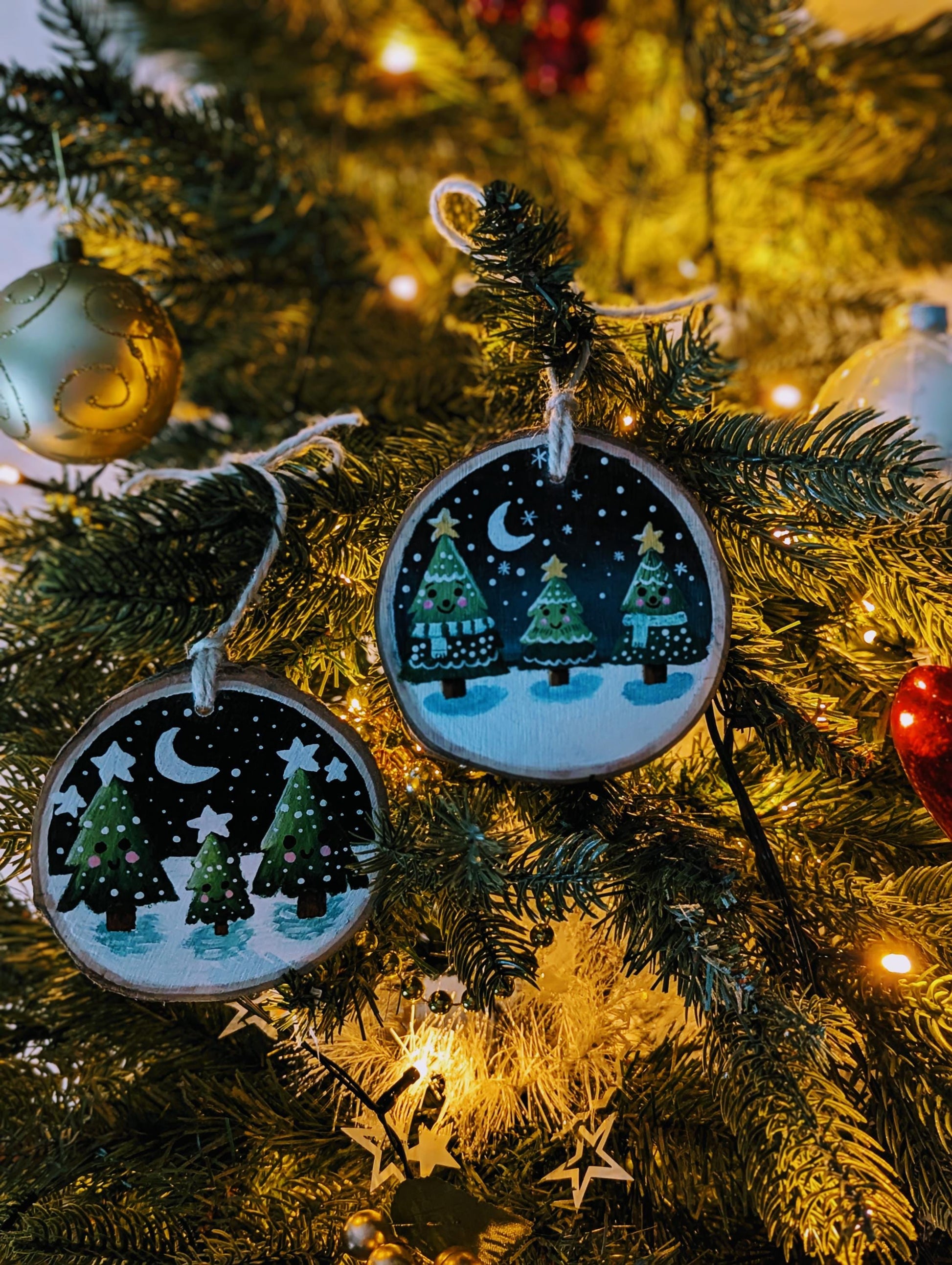 These little Christmas tree ornaments are painted on a natural wood slice, creating a rustic yet adorable addition to your holiday decor. In a snowy night sky with full moon and gentle snowflakes, these ornament are perfect for a cozy, personal feel. Each ornament is unique made with love and makes a wonderful gift for Family members or friends or anyone who enjoys festive decor.