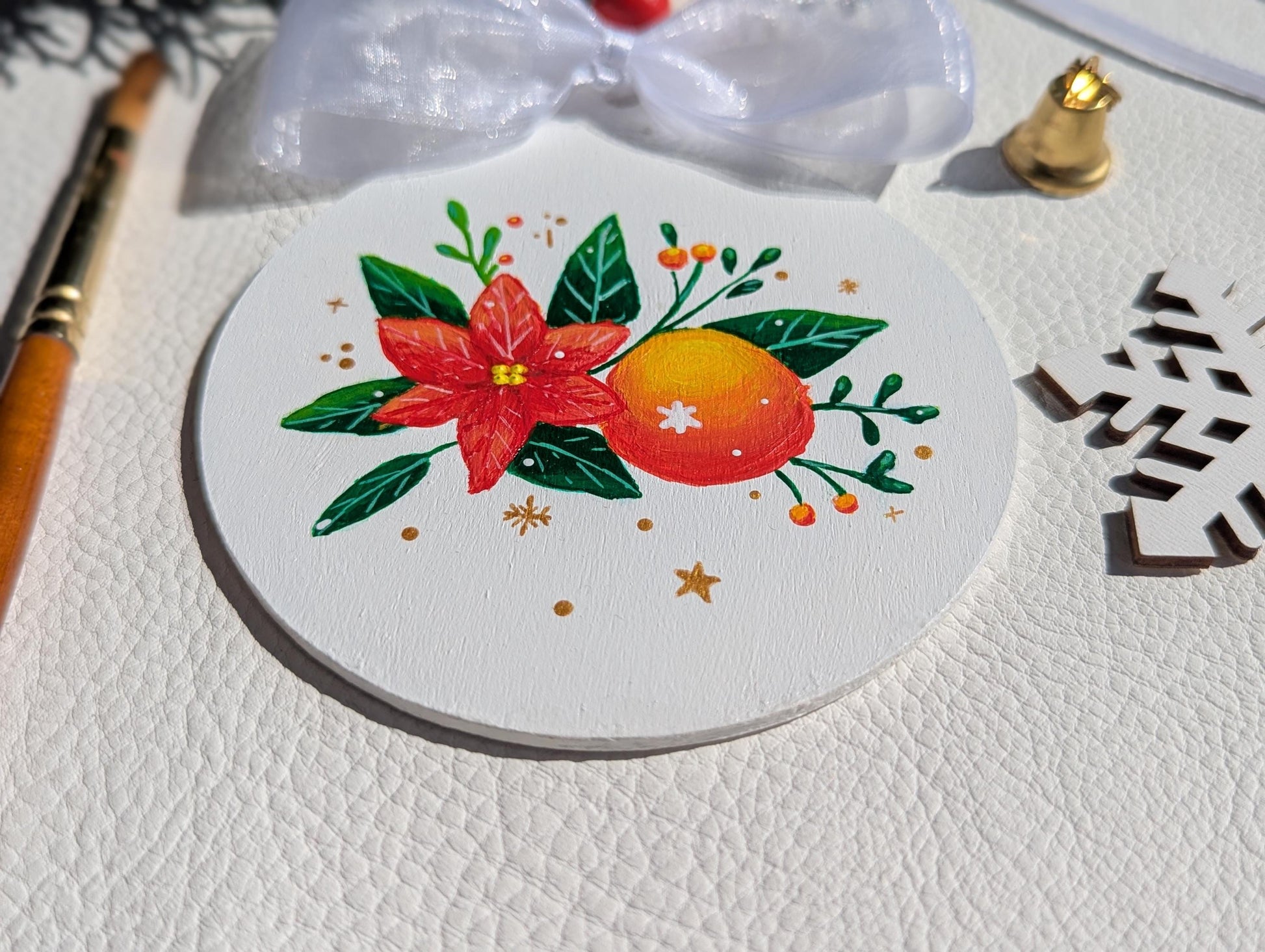 Hand-Painted Wooden Christmas Ornament: Christmas Flowers and Orange Design
