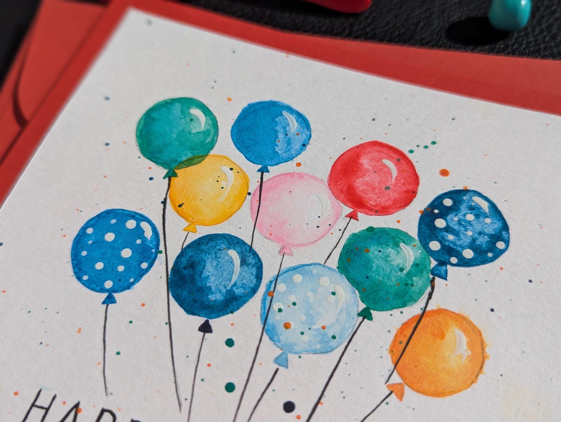 Celebrate a special birthday with this beautiful handmade card! Featuring a vibrant Ballons design in warm tones of red, orange, yellow and blue, this card adds a personal and artistic touch to your birthday wishes.