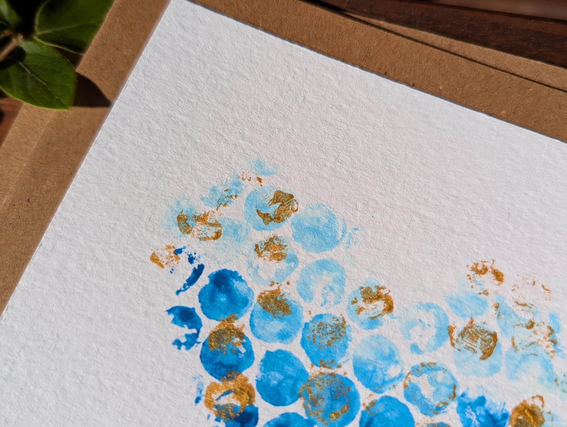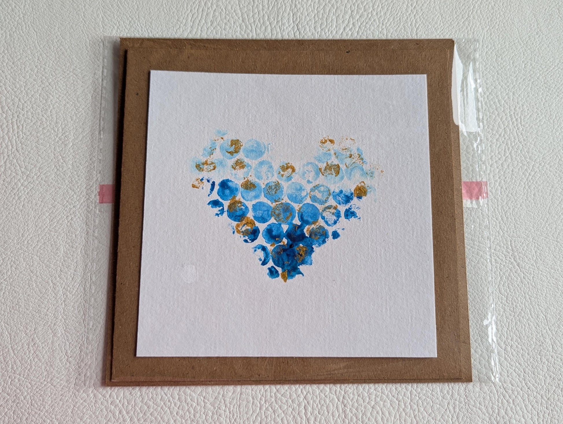 Send some love with this handmade card featuring a unique heart design in beautiful shades of blue and gold. The bubble-texture art adds a fun, creative touch, making it perfect for birthdays, anniversaries, or any special occasion. Made with care and attention to detail, it’s a sweet and thoughtful way to show someone how much they mean to you. Perfect for anyone who loves simple, creative, and meaningful designs!