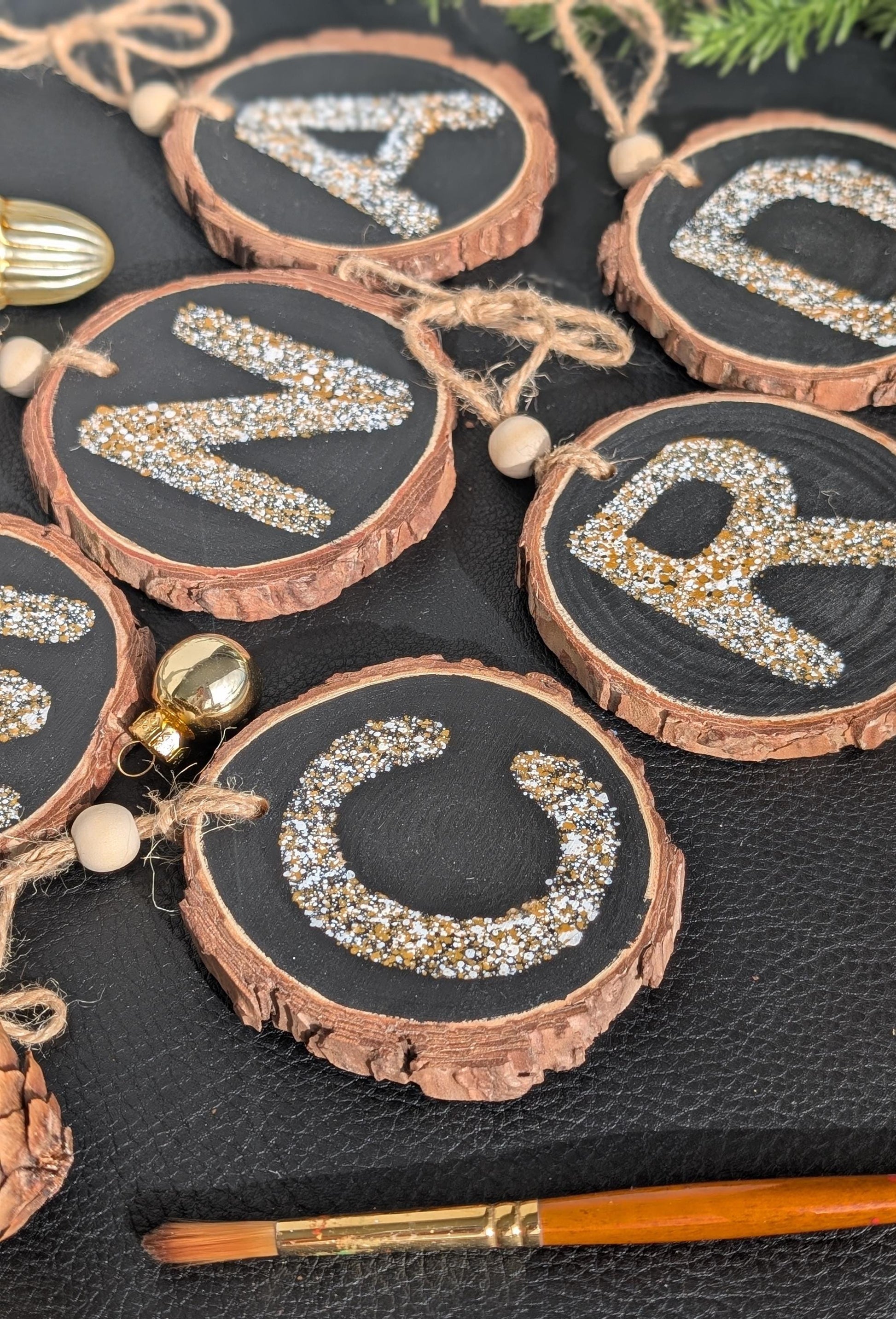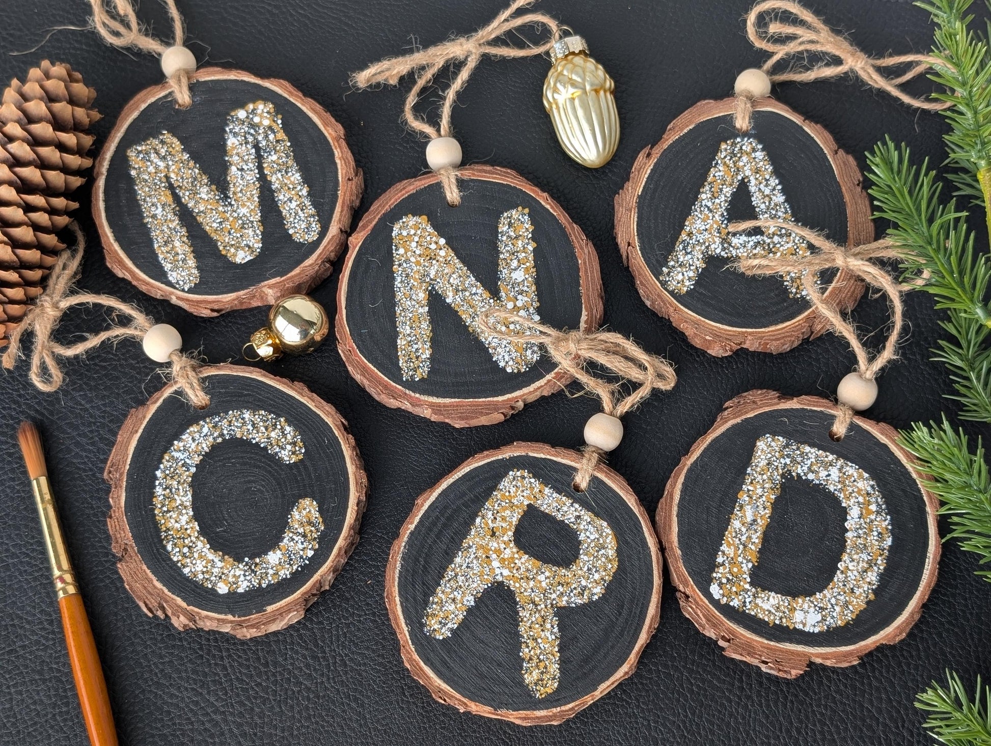 Bring a pop of color to your tree with this hand-painted wooden ornament! With Minimalist Custom Letter design on a natural wood slice with a black background, this ornament adds a festive, rustic in modern in the same time , bring a touch of charm to your holiday decor. It comes with a white ribbon for easy hanging and makes a perfect gift or addition to your Christmas collection.